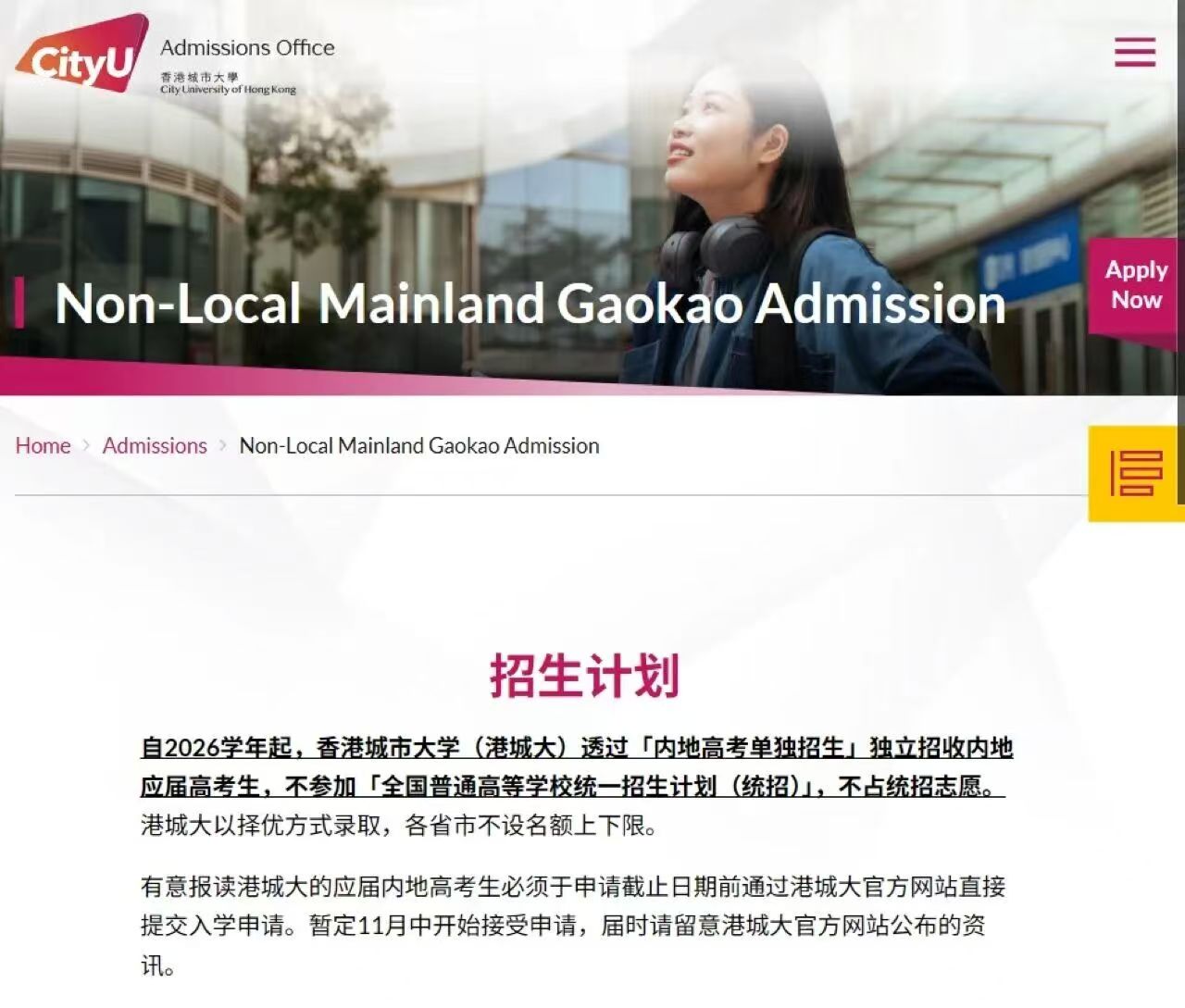 香港城市大學(xué)官網(wǎng)發(fā)布2026學(xué)年退出高考統(tǒng)招批次,改為獨立招收內(nèi)地應(yīng)屆高考生!一起來看看吧!